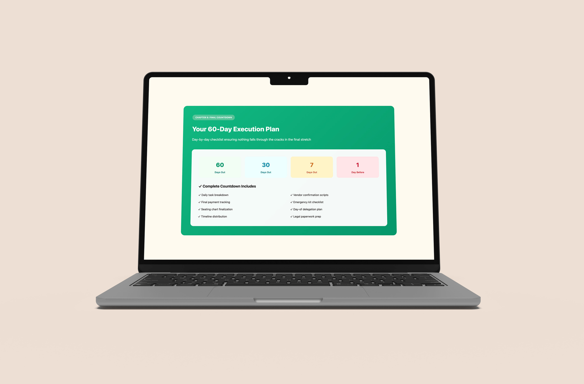 10 chapters, 26 templates, budget mastery, vendor strategies, design tools, and emergency plans. Your all-in-one wedding planning headquarters.